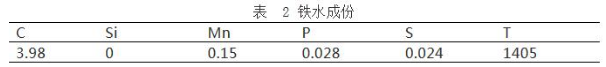 前期渣中加入石灰3 噸,輕燒 3 噸,冷料 3.5 噸,在吹煉到 1800 氧后起槍倒渣,此時的轉爐內鐵水溫度為 1405 度,成份如下表: