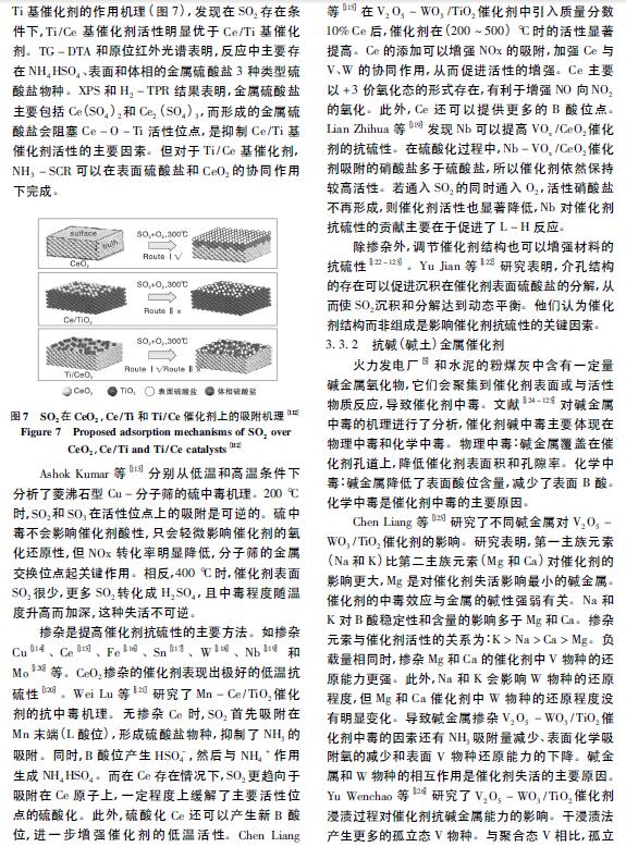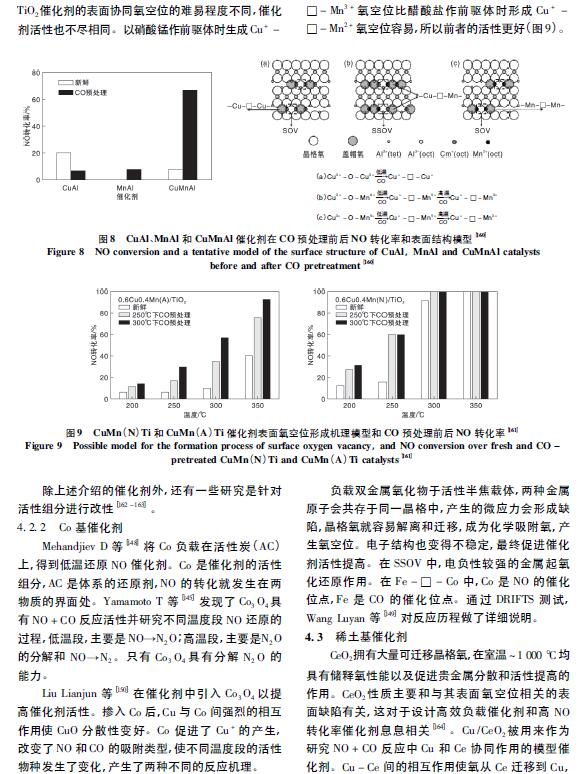 在CeTi 催化劑中,Ce 和Ti 在原子級別上的相互作用產生的Ce - O - Ti 有助于提高催化劑活性。Li Ping 等[75]用FETEM 直接觀察到Ce - O - Ti 結構,無定型Ce0. 3 TiO∞在( 175 ~ 400) ℃ 時的NO 轉化率為90%。此外,利用XANES 和原位FTIR 等證明了表面高度分散的Ce - O - Ti 結構是反應的活性中心。Chen Lei 等 利用溶膠- 凝膠法合成CuCeTi 催化劑,在( 150 ~ 250) ℃時的NO 轉化率大于80%,Cu 提供的L 酸位點成為反應的活性中心,加速了低溫段快速SCR 反應過程。在此基礎上進行改進( 圖5) ,在Ce - Ti 催化劑中摻雜了少量Cu2 + ,可以顯著提高催化劑的低溫SCR 活性。研究表明,Cu 與Ce 物質的量比0. 005 時,( 200 ~400) ℃的NO 轉化率為80%,N2選擇性為100%。Cu - O - Ce 的形成促進了Ce4 + 向Ce3 + 的轉化,增加了表面活性氧。分散態Cu 增加了Ce -Ti 催化劑表面酸性,提高了NH3吸附能力,從而加速了反應向E - R 機理方向進行。在Ce - Ti 催化劑中摻雜W 可以在Ce - W 間產生強烈的相互作用,產生更多的Ce3 +、NOx 和NH3吸附物種,從而提高催化劑活性。Fu Mengfan 等發現,采用共浸漬法時,在( 200 ~ 400) ℃ 的NO 轉化率大于90%。利用均相沉淀法進一步提高了Ce -W - Ti 催化劑在高空速下的活性,在Ce 與W 物質的量比1∶ 1、空速500 000 h - 1和溫度( 275 ~ 400) ℃條件下,NO 轉化率為90%。W 的引入促進了活性Ce 的分散,增加了催化劑表面活性CeO2晶體、氧空位和酸位。在低溫段( < 300 ℃) ,W 促進了NO 向NO2的氧化,在高溫段( > 300 ℃) ,W 提高了N2選擇性。